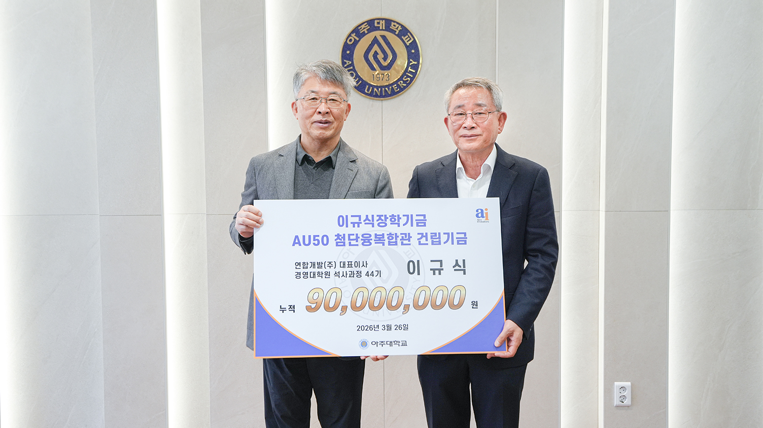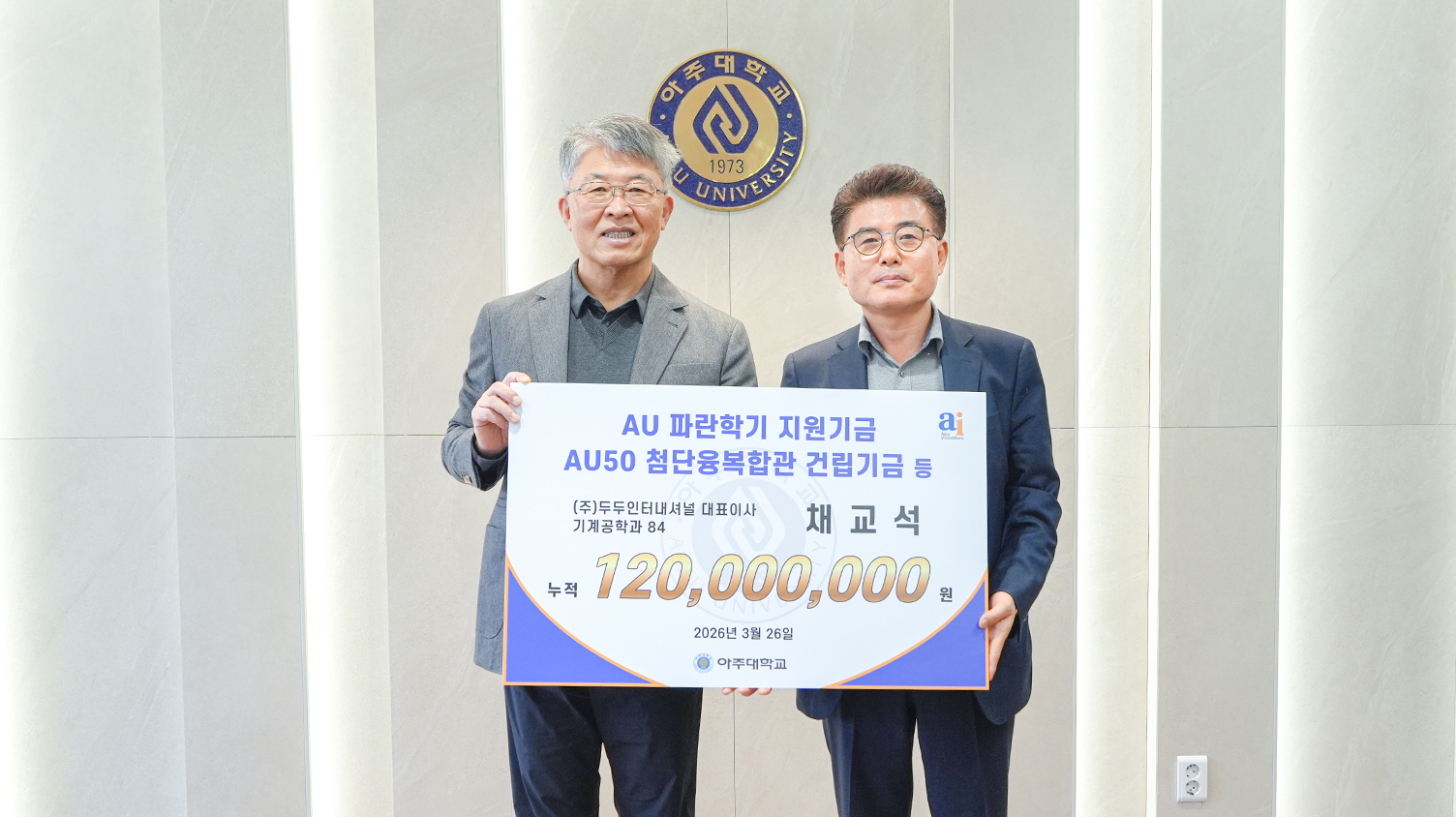 26일 율곡관 총장실에서 열린 기부금 전달식에는 채교석 ㈜두두인터내셔널 대표이사, 이규식 ㈜연합개발 대표이사, 김동율 주식회사 액트(ACTS) 대표이사가 참석했다. 학교에서는 최기주 총장과 조경숙 대학발전본부장, 강민철 경영인텔리전스학과 교수가 자리했다. 최기주 총장이 아주가족을 대표해 감사 인사를 전하고, 감사패와 예우품을 전달했다.