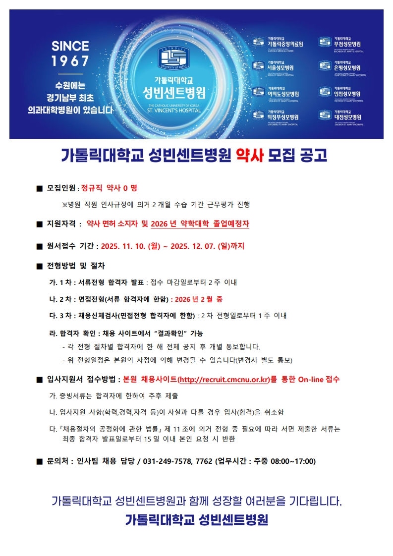 [취업] 가톨릭대학교 <성빈센트병원> 약사 채용공고