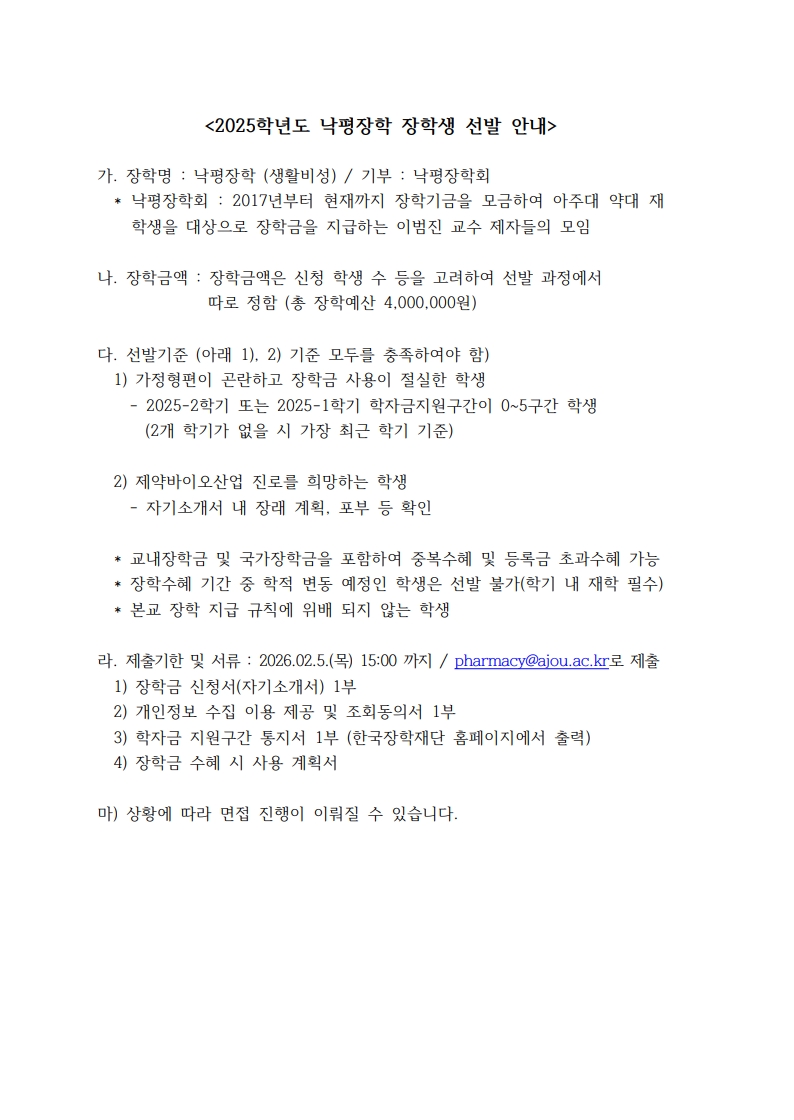 2025학년도 낙평장학 장학생 선발 안내